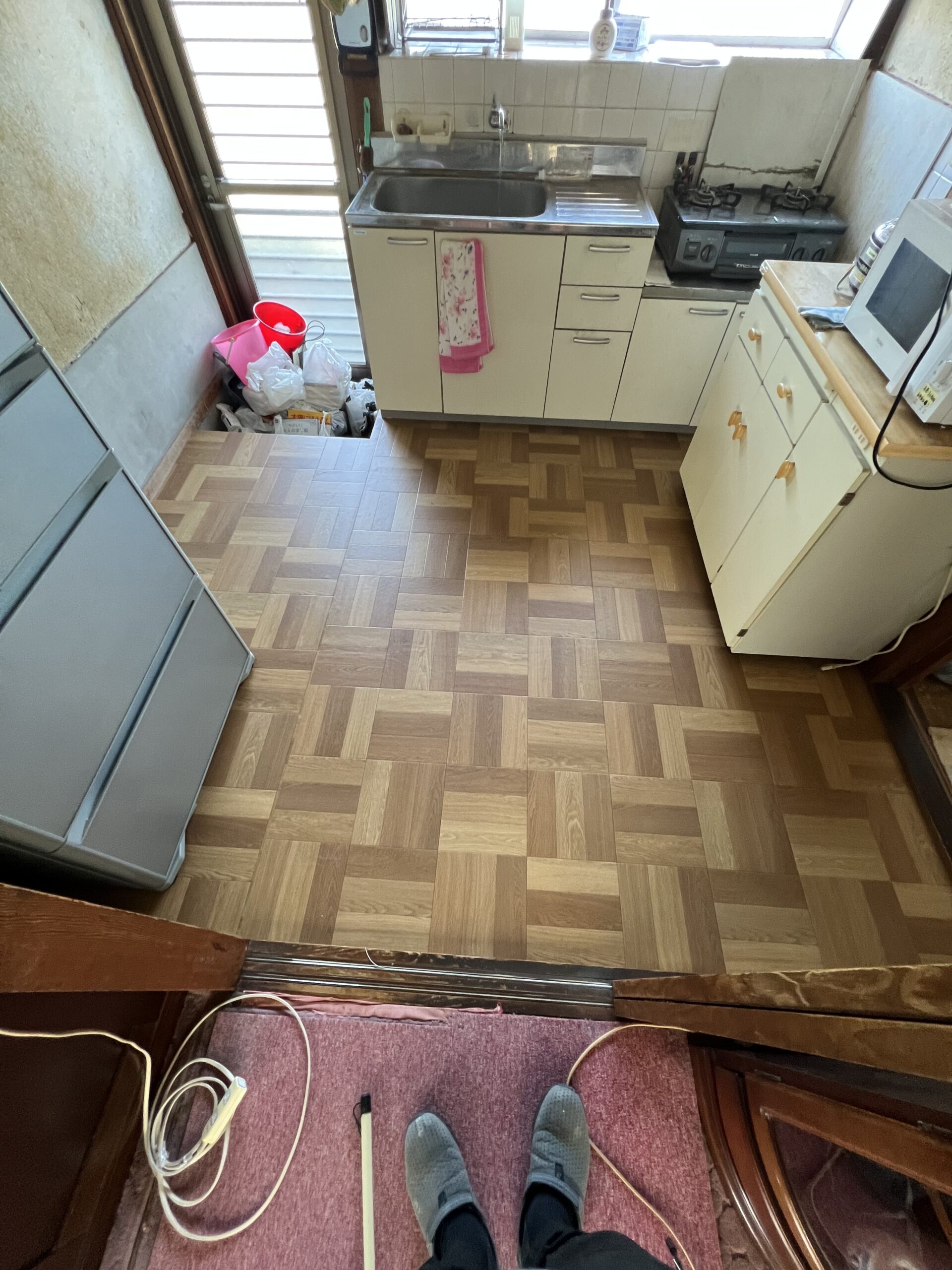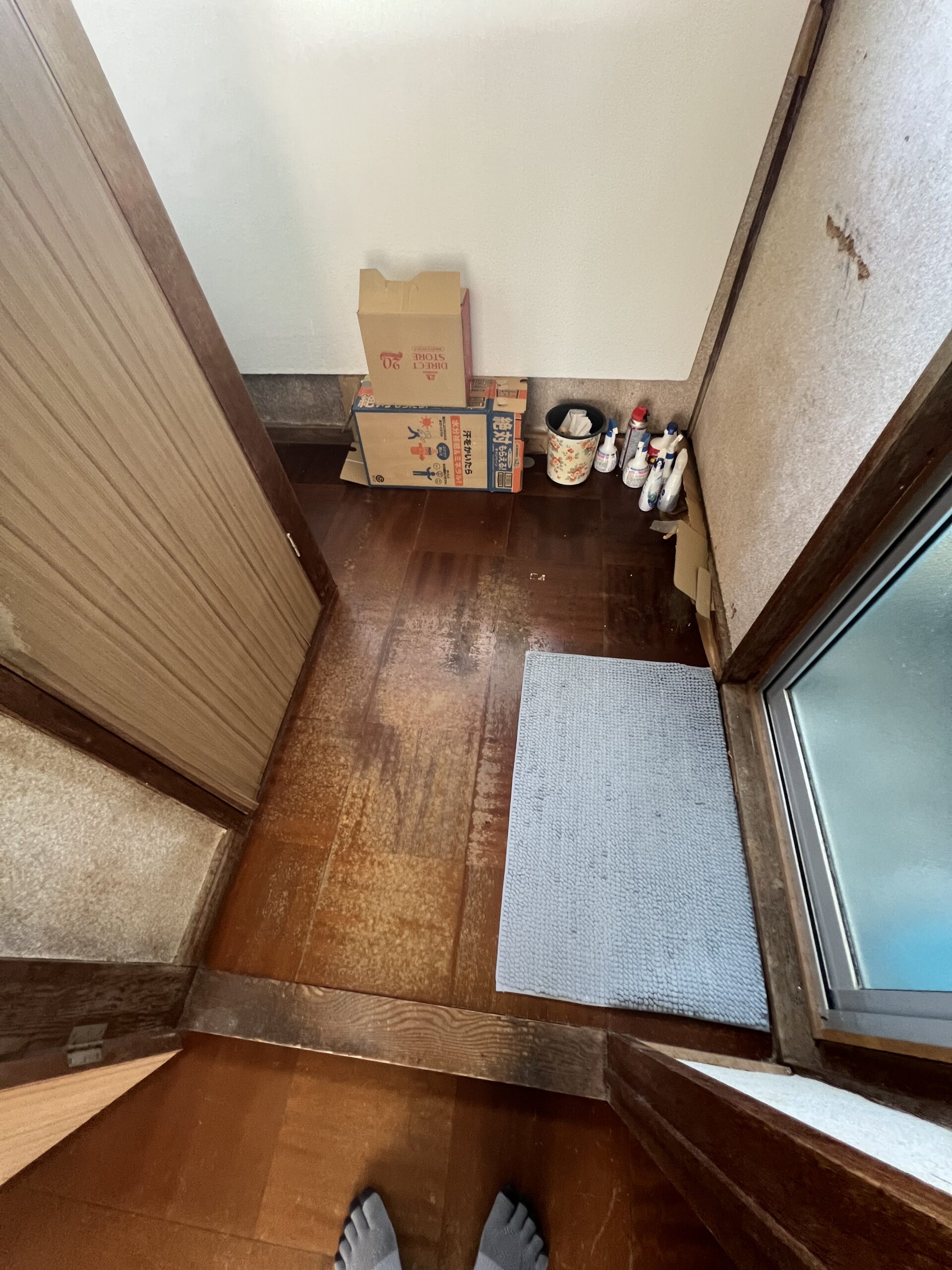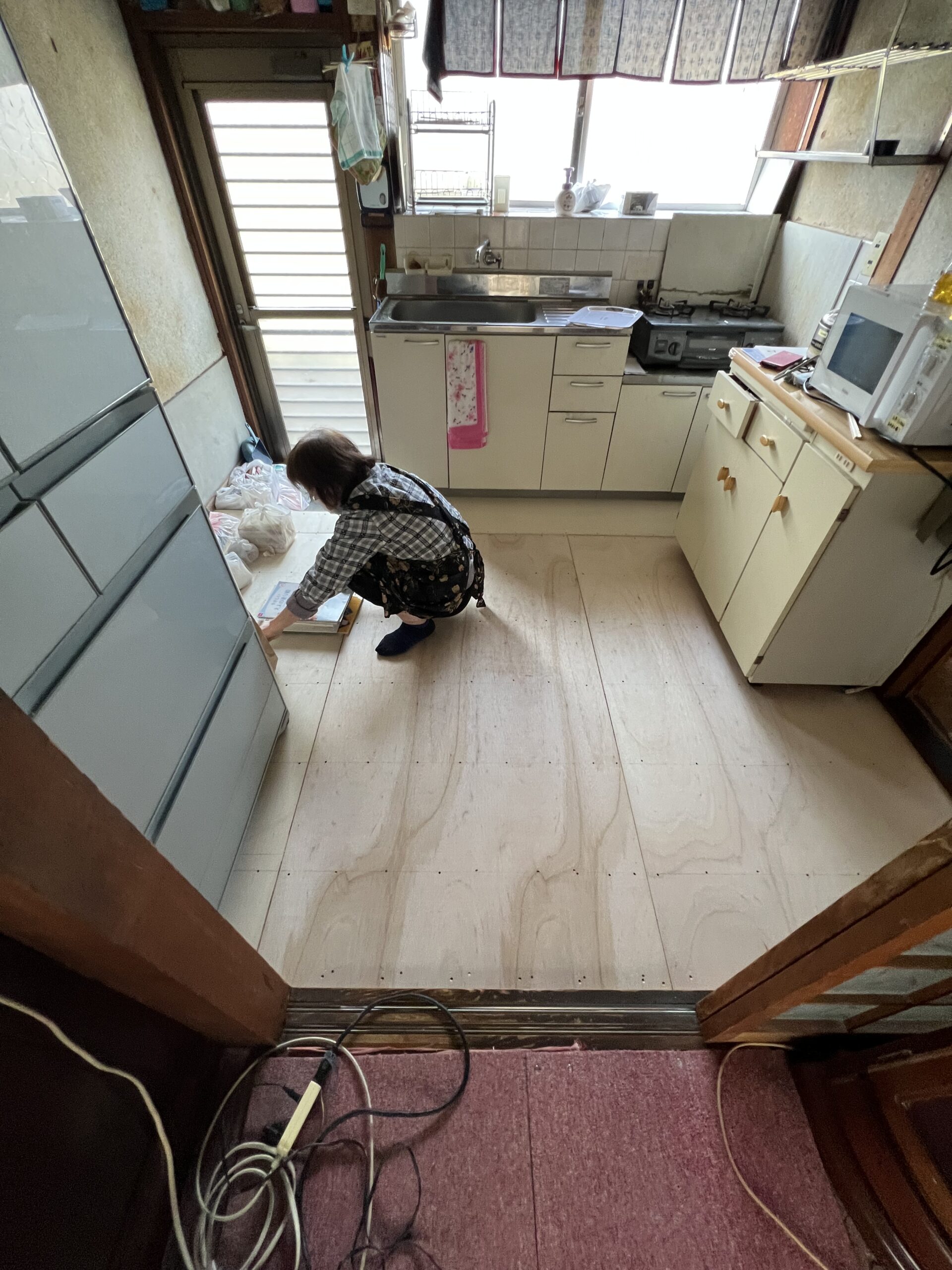 こんにちわ!インテリア北斗の小山です。今回は岡山市中区の借家にて床の沈み等で危険なので直したいとの事で床の下地から直させて頂きました。