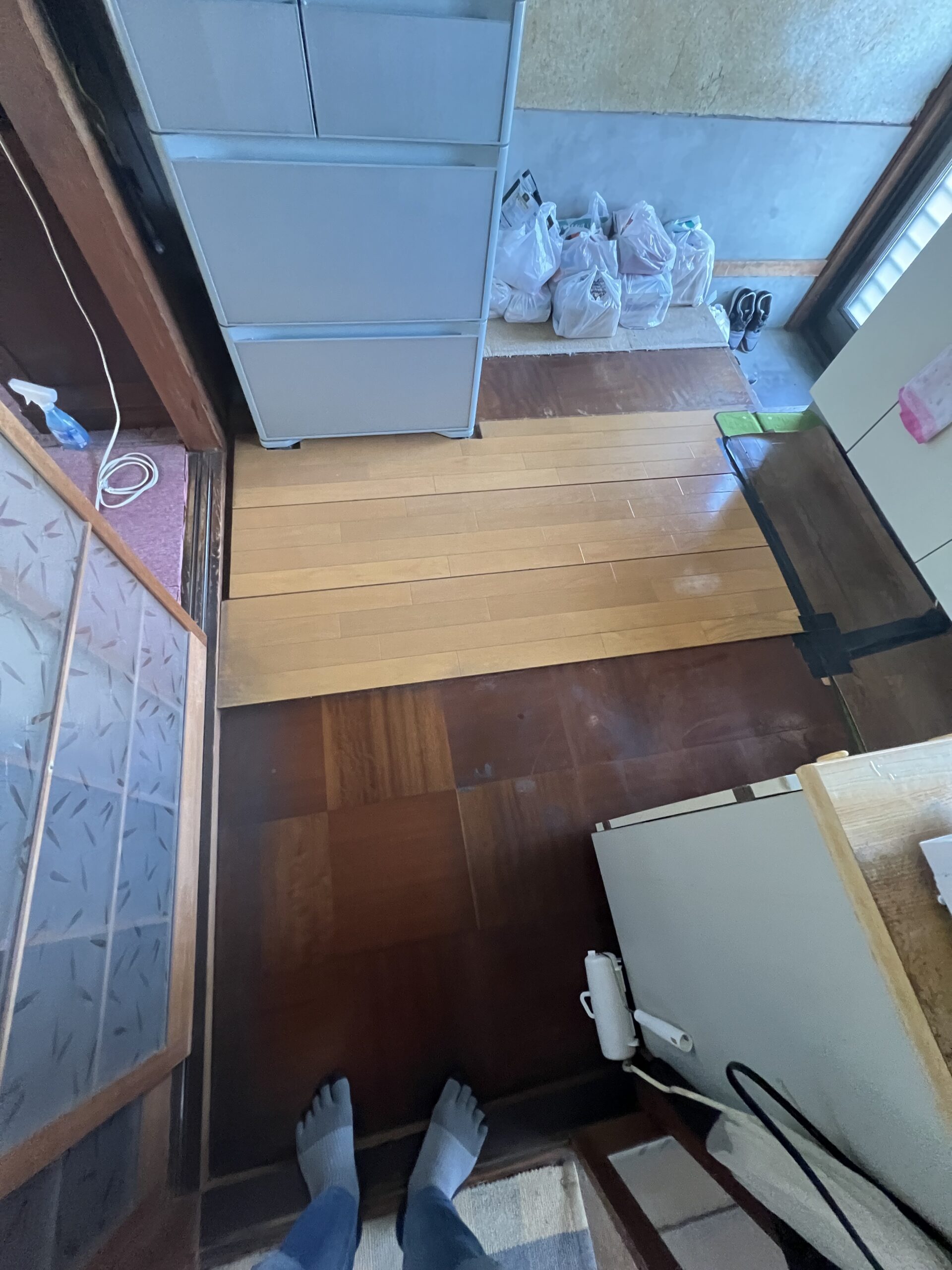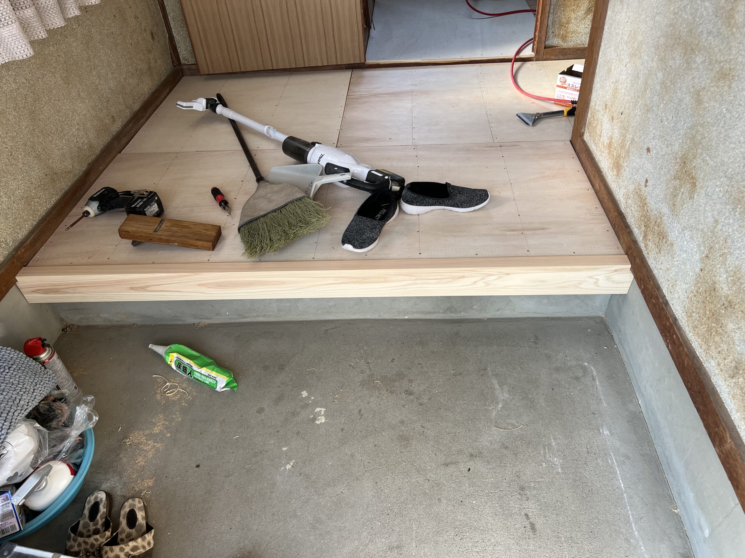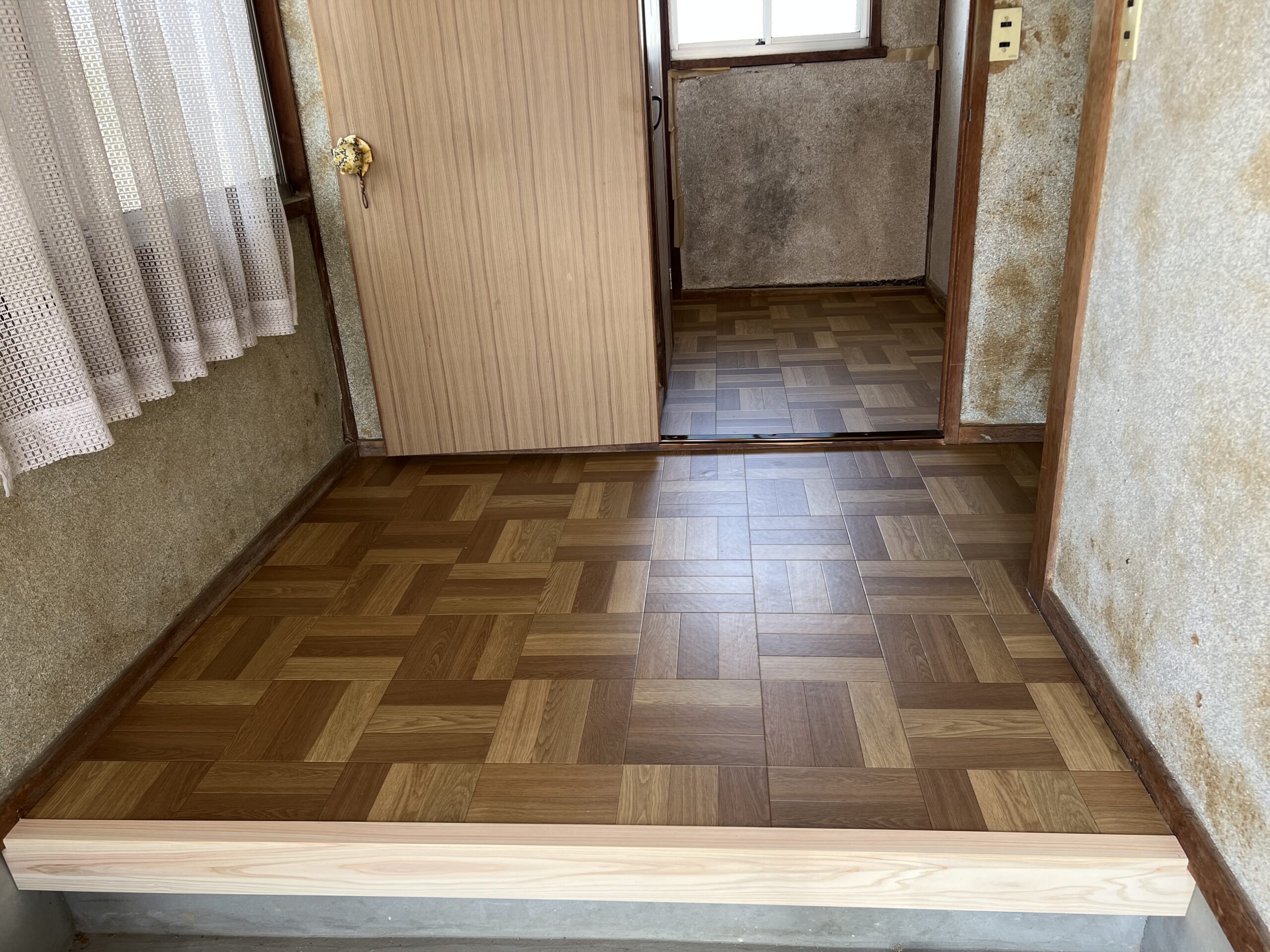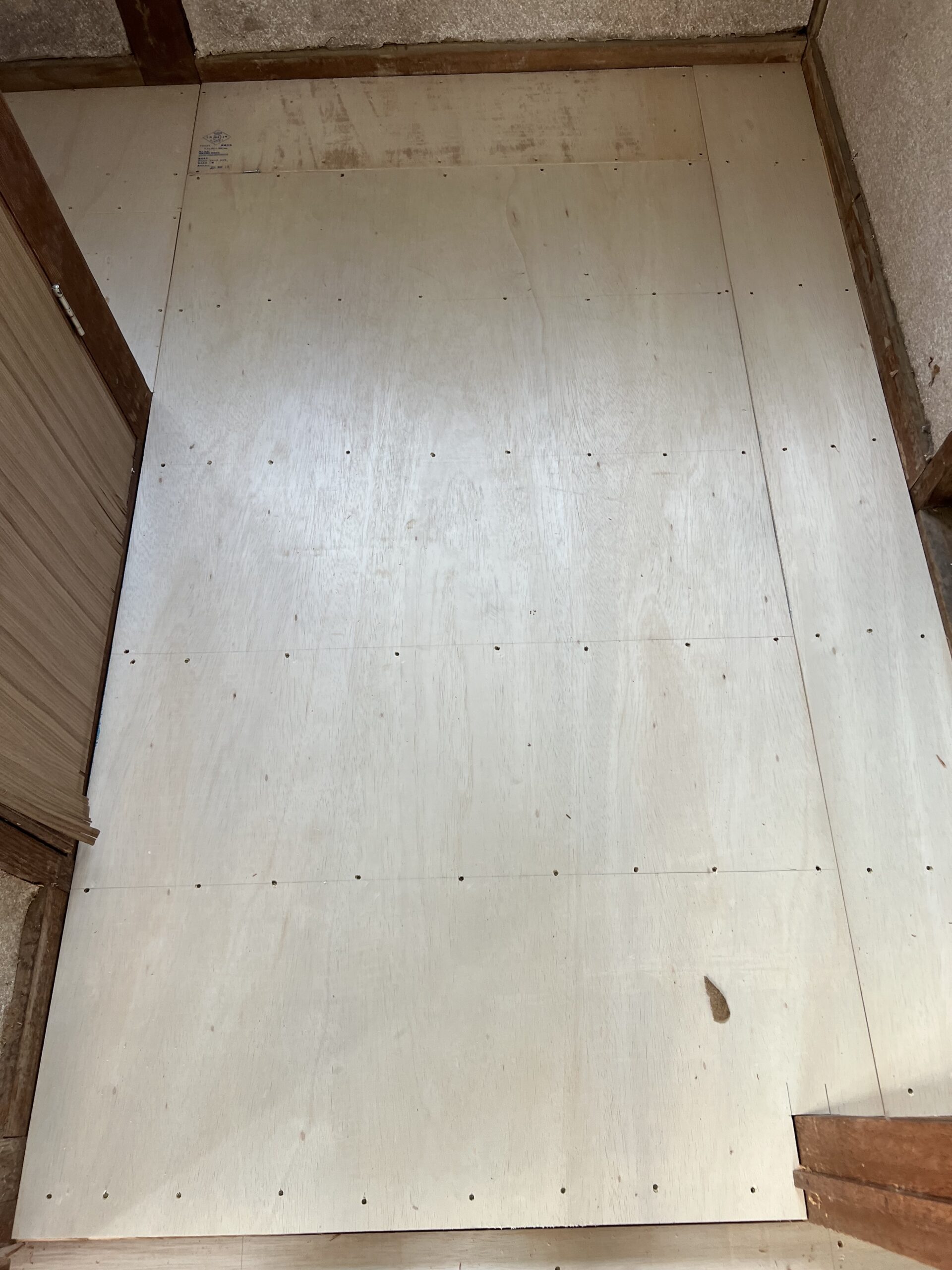 作業内容・床下地解体・床下地新設・床コンパネ貼り・玄関框新設・床仕上げCF貼り・見切り金物設置