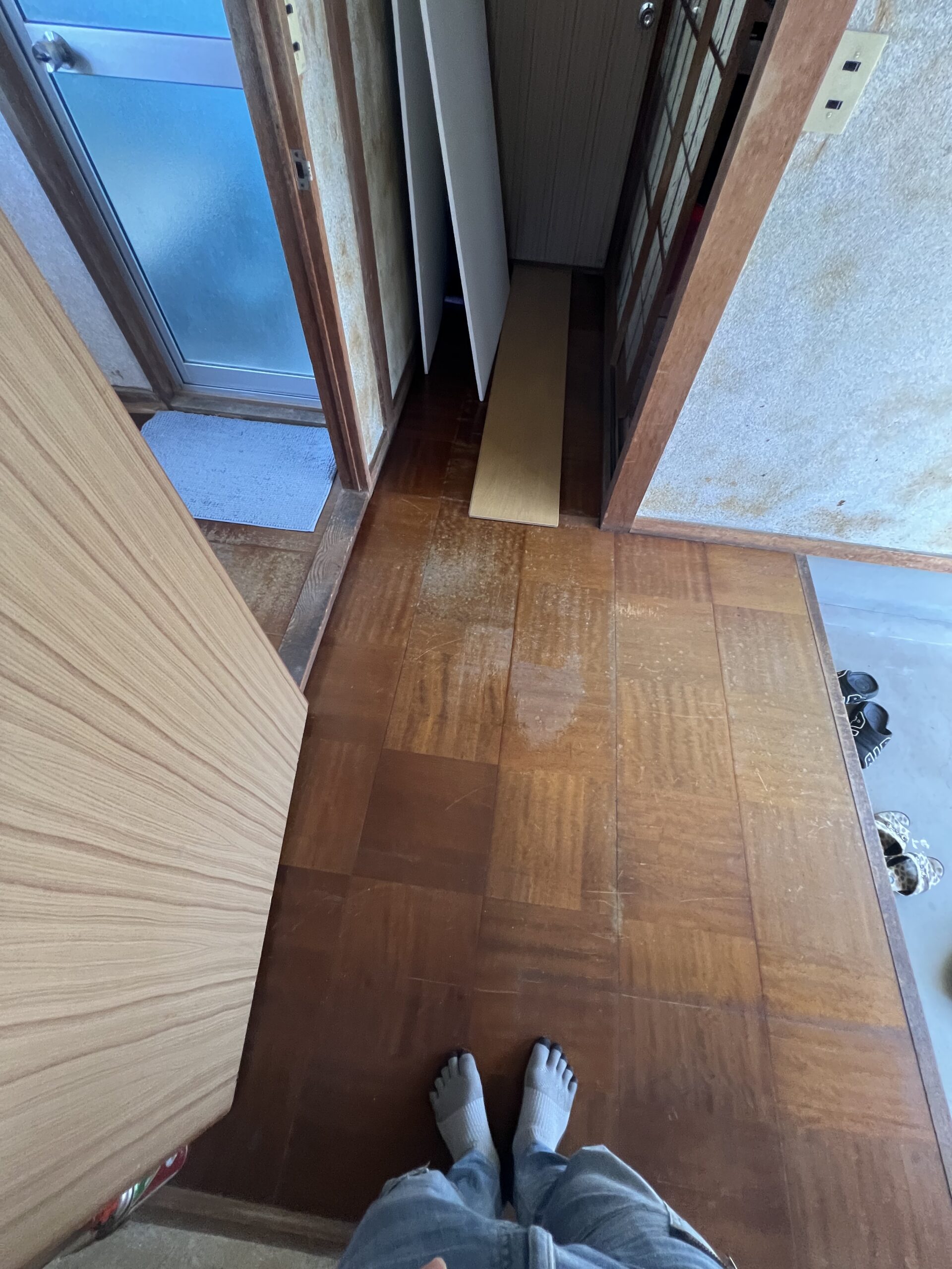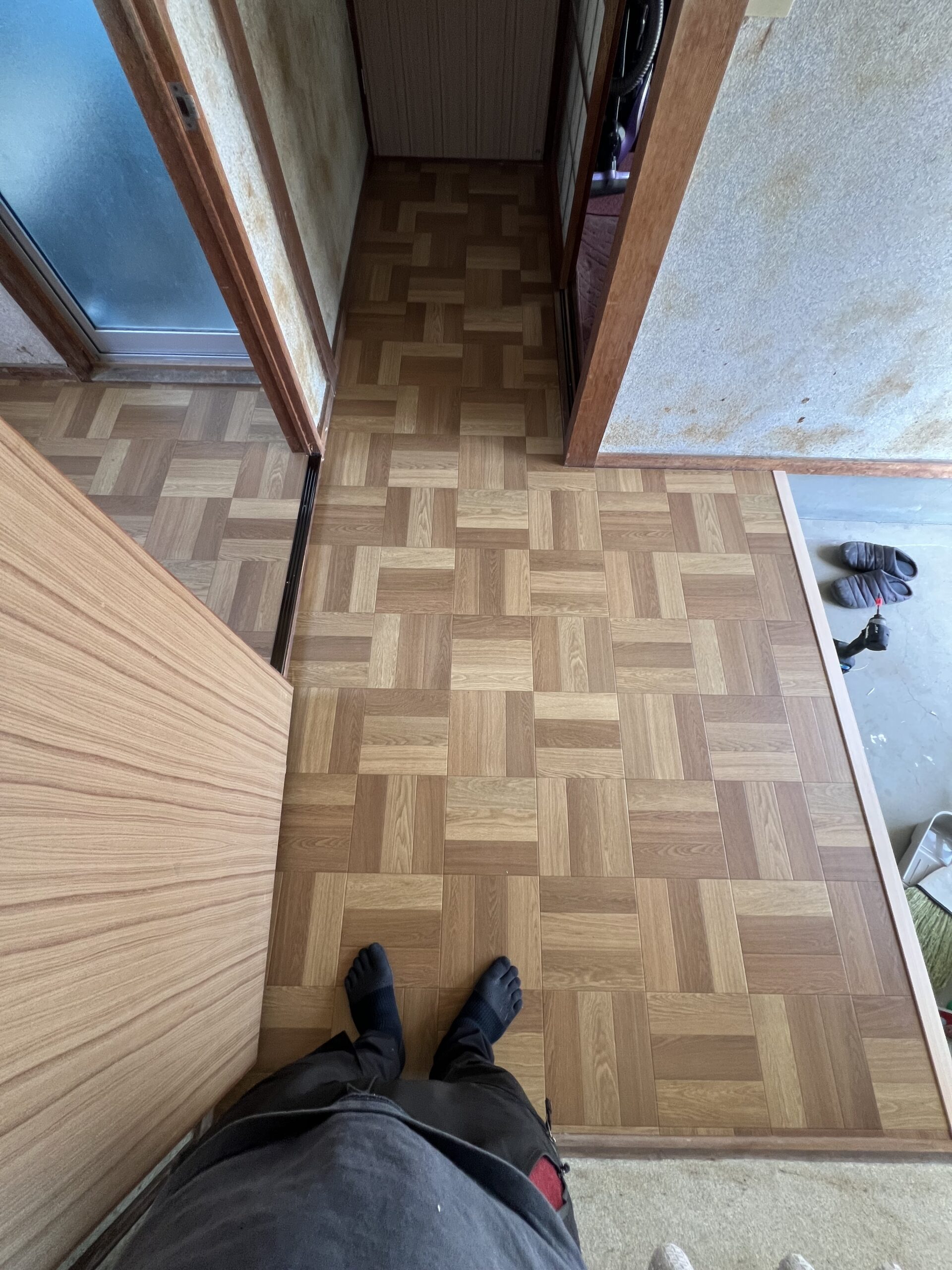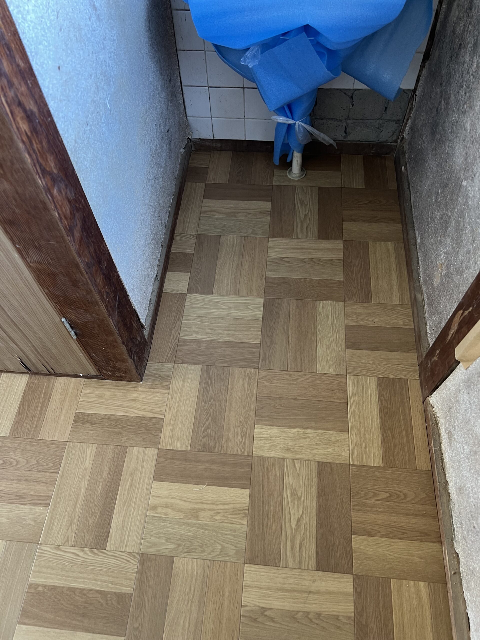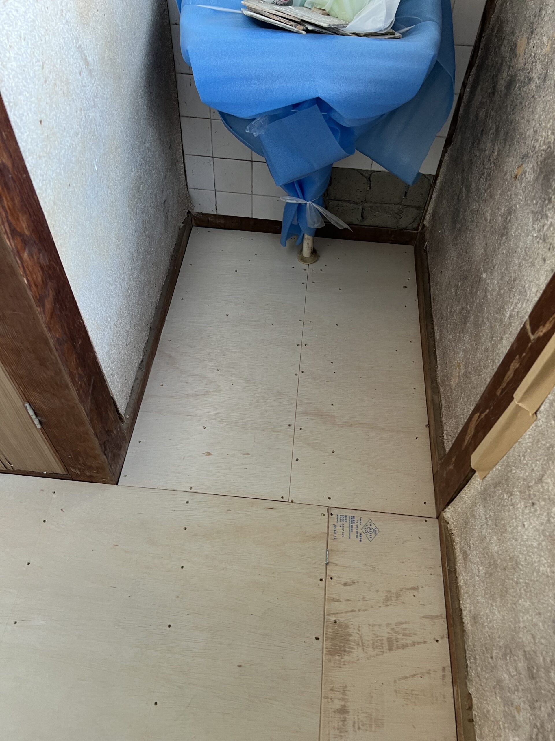 作業内容・床下地解体・床下地新設・床コンパネ貼り・玄関框新設・床仕上げCF貼り・見切り金物設置
