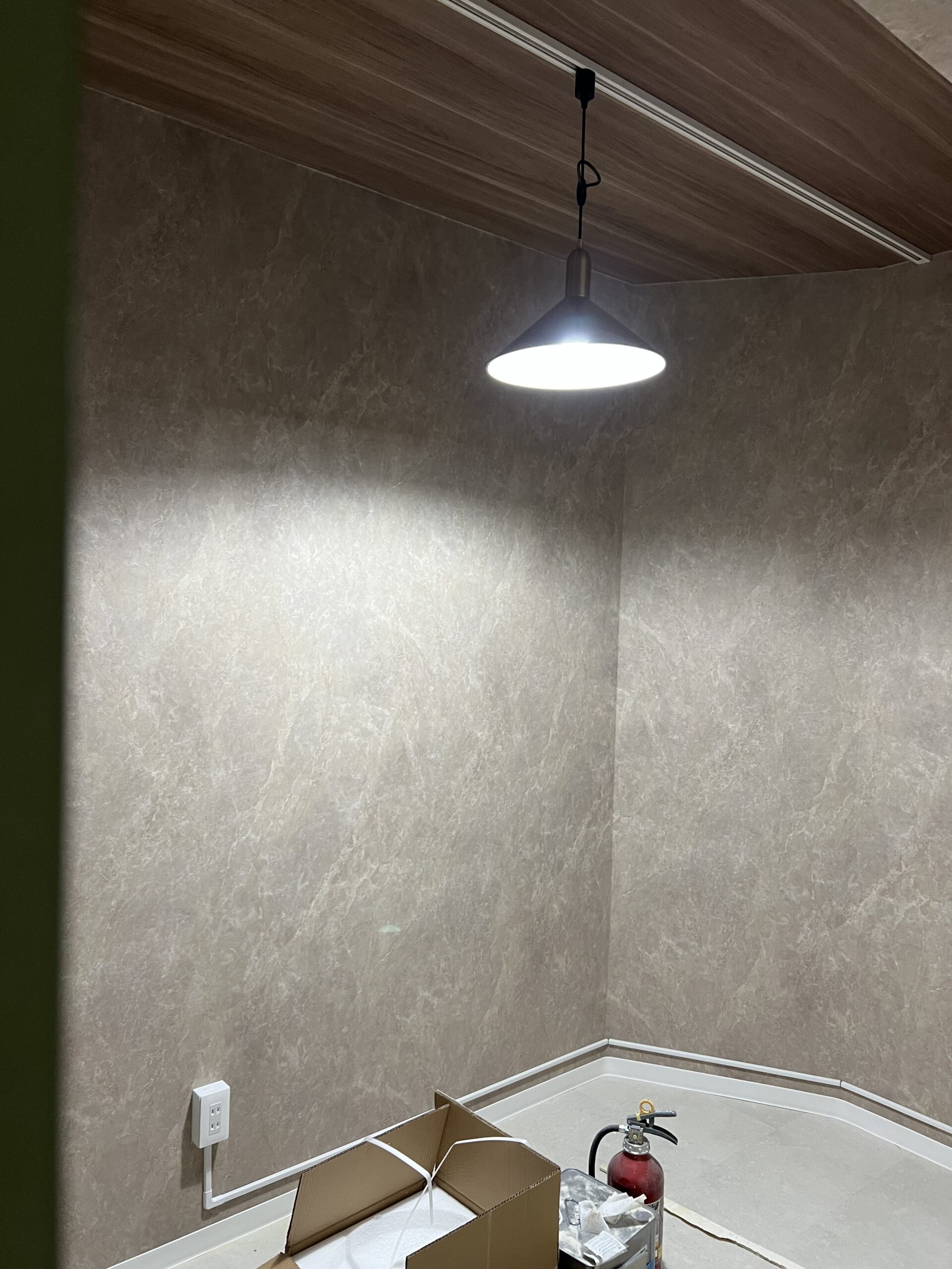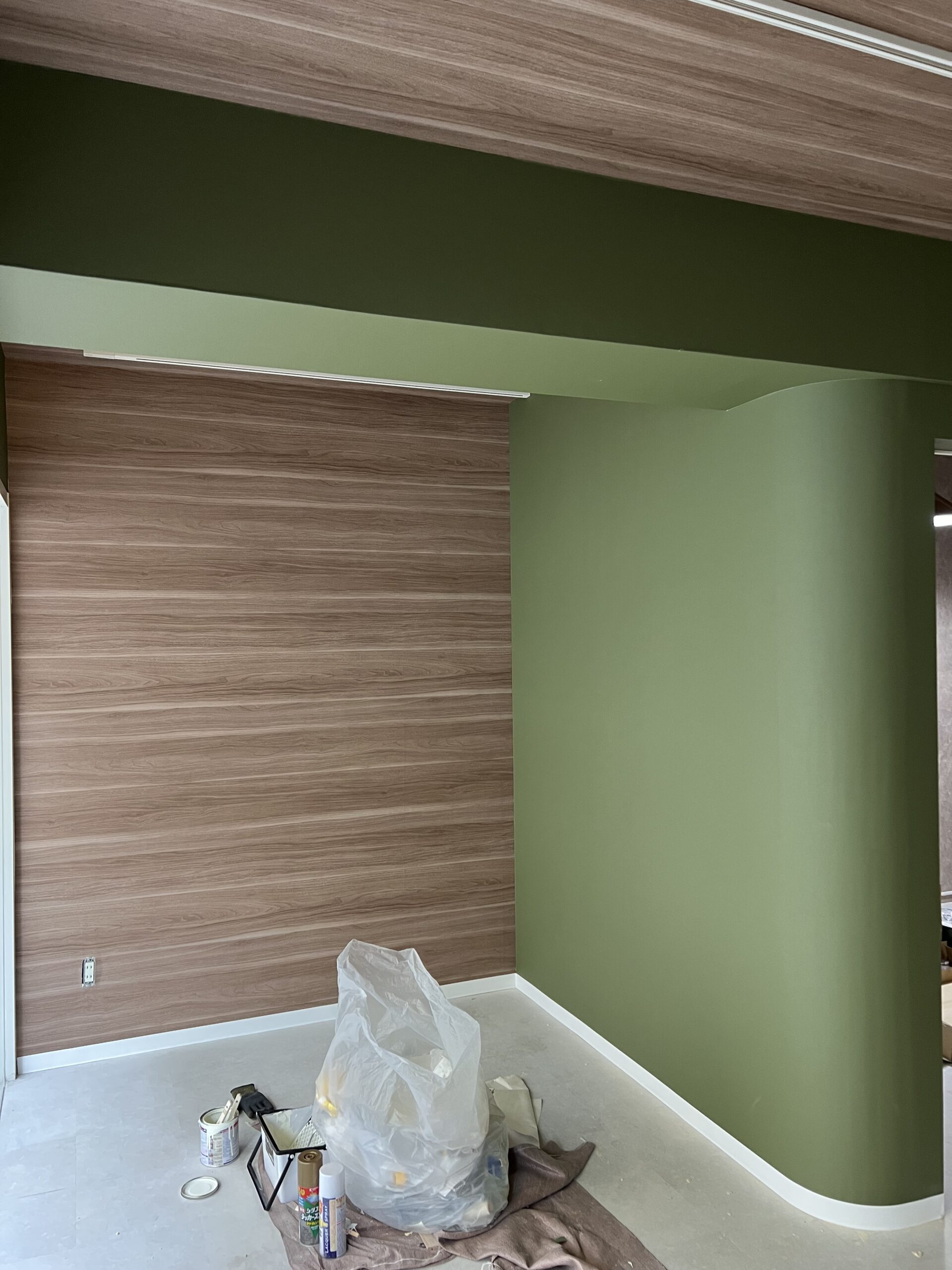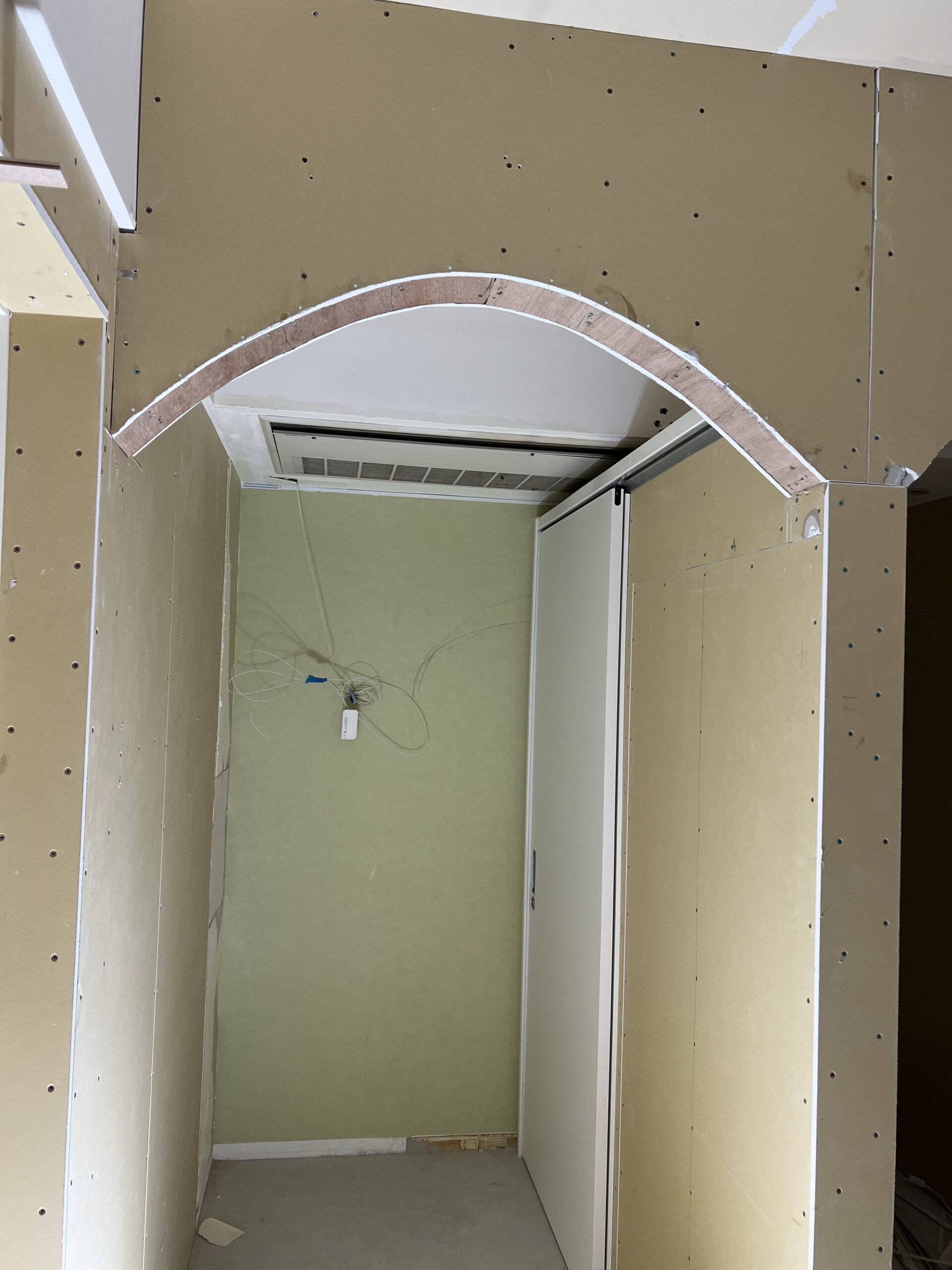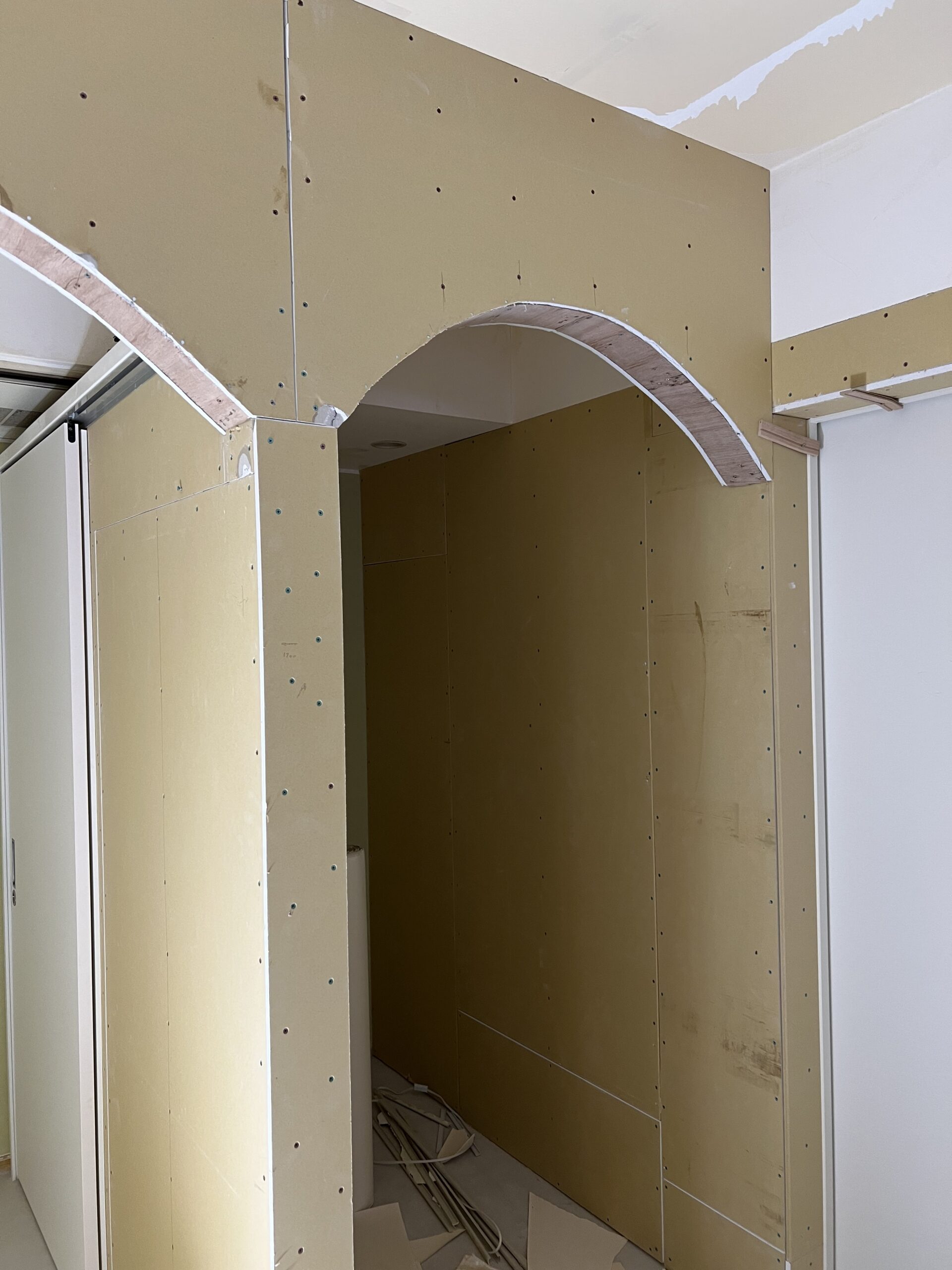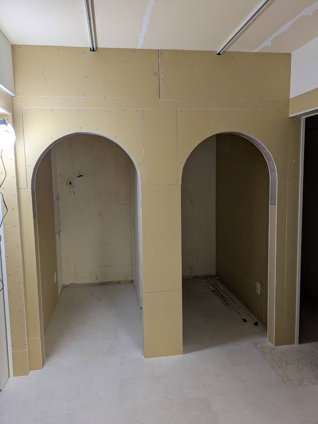 今回は前業者のアーチ壁をやりなおして、壁紙の張り替え、電気工事をさせていただきました。