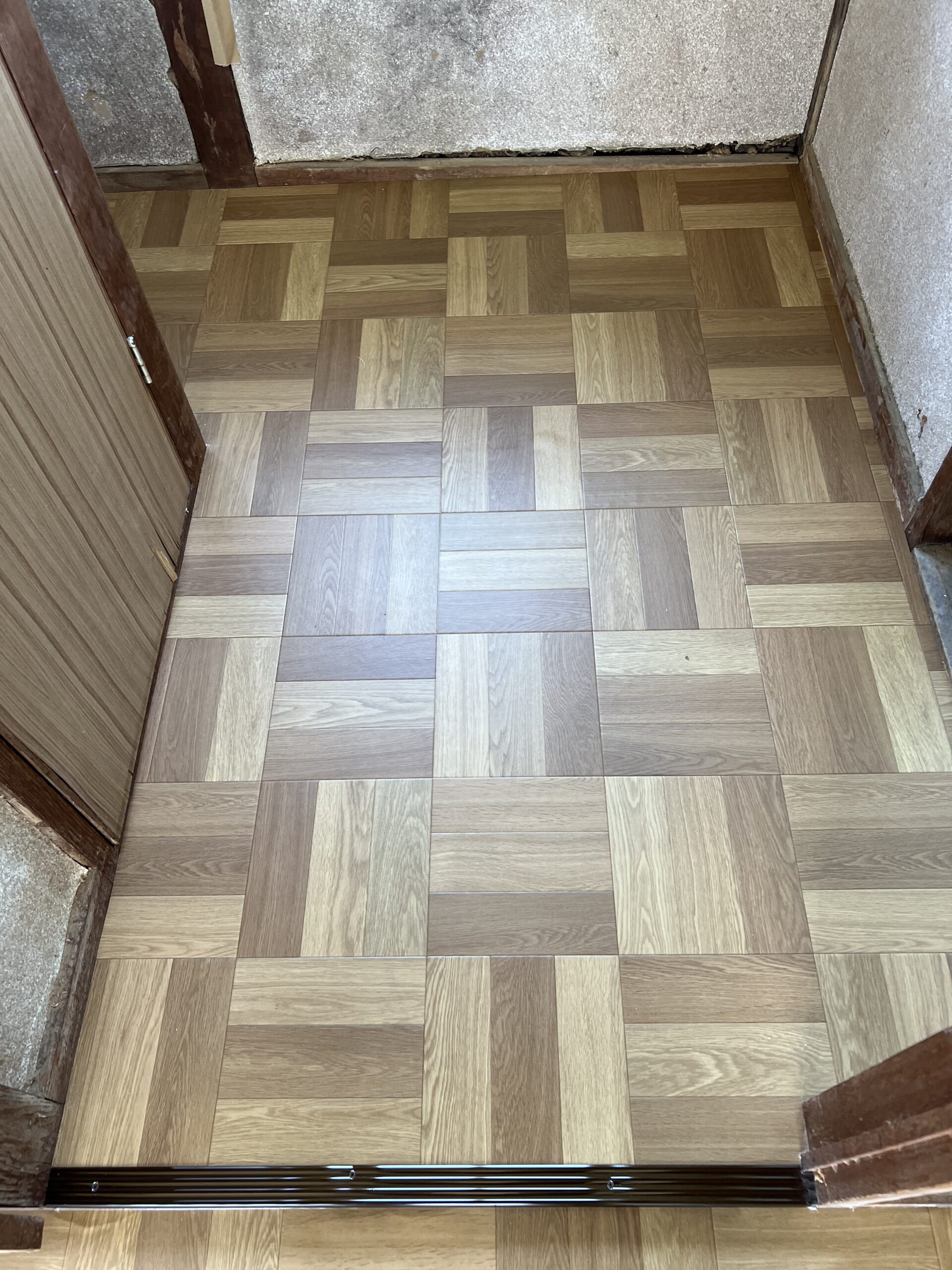 こんにちわ!インテリア北斗の小山です。今回は岡山市中区の借家にて床の沈み等で危険なので直したいとの事で床の下地から直させて頂きました。作業内容・床下地解体・床下地新設・床コンパネ貼り・玄関框新設・床仕